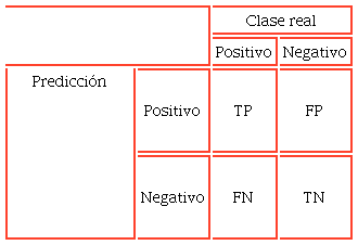 Donde: TP (Verdadero positivo): Número de muestras de clase positiva, predichas como positivas (clasificadas correctamente); TN (Verdadero negativo): número de muestras de clase negativa, predichas como negativas (clasificadas correctamente); FP (Falso positivo): número de muestras de clase negativa, pronosticadas como positivas (clasificadas incorrectamente); FN (Falso negativo): número de muestras de clase positivas, predichas como negativas (clasificadas correctamente).