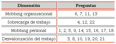 El primer instrumento tiene 22 preguntas sobre acoso laboral, mide cuatro dimensiones, estas son las siguientes: mobbing organizacional, sobrecarga de trabajo, mobbing personal y desvalorización del trabajo. La Tabla 3 muestra las preguntas que corresponden a cada dimensión.