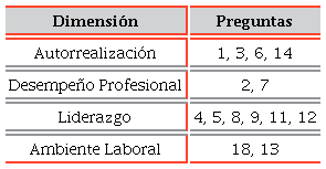 El segundo instrumento contiene 14 preguntas sobre satisfacción en el trabajo. Las opciones para cada respuesta en este instrumento son muy bajo, bajo, medio, alto, muy alto. Las dimensiones que mide este instrumento son la Autorrealización, Desempeño Profesional, Liderazgo y Ambiente Laboral. La Tabla 4 muestra estas dimensiones, y las preguntas que corresponden a cada una de ellas.