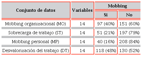 Los conjuntos de datos obtenidos con el proceso explicado en la metodología, y que se usaron para construir las SVM para predecir el acoso laboral a partir de la satisfacción en el trabajo son los mostrados en la Tabla 5. En la misma tabla se puede observar que el mobbing personal es el tipo de acoso menos frecuente en nuestra muestra (16%), mientras que la desvalorización del trabajo es la más frecuente (47%).