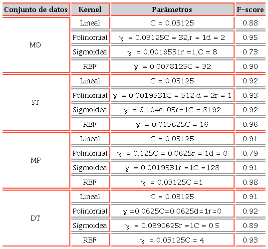 Para la selección del núcleo más apropiado para el SVM, se probaron los cuatro más utilizados en la literatura (ver Tabla 1). Estos núcleos son la función de base lineal, polinomial, sigmoidea y radial. Para cada uno de ellos, se aplicó un método de búsqueda de cuadrícula para determinar el mejor valor posible de sus hiperparámetros, esto con respecto a F-score. El objetivo del método de búsqueda de cuadrícula es identificar los mejores valores de los parámetros que permiten clasificar con precisión los datos nunca vistos anteriormente.
