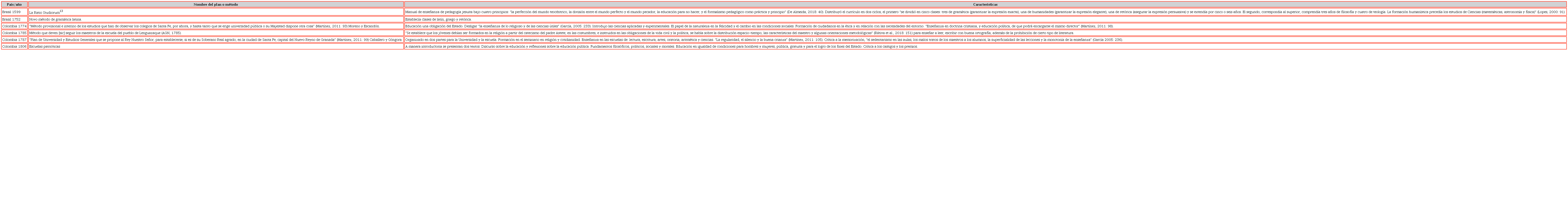 Durante la época surgieron algunos planes y métodos que se describen en la Tabla 1, cuyas propuestas educativas se establecieron para ser implementadas en las escuelas, los cuales definían o señalaban una ruta a seguir; en ellos se identifican aspectos referidos a las asignaturas, cómo enseñarlas, consejos para la implementación y prohibiciones.