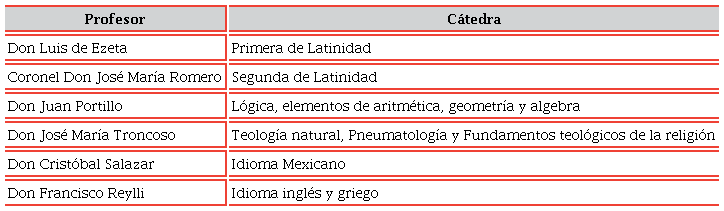 Por lo que toca a la designación de los profesores, fueron seis catedráticos, cuyos nombres se pueden ver en el siguiente cuadro. No necesariamente se cumple la idea de una secularización educativa. Por el contrario, podemos inferir por la composición del profesorado presente en esa lista, en el que participaron un militar y un clérigo, el predominio de cierto liberalismo católico en la enseñanza. Ahora bien, sin duda, el reordenamiento educativo impulsó nuevas áreas de conocimiento en los estudios medios o preparatorios.