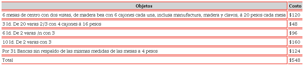 Lo primero que se decidió hacer con el nuevo espacio designado fue realizar gastos para adecuar el inmobiliario. Contamos con una lista del 3 de enero de 1834, sobre las compras realizadas para adecuar el espacio educativo y echarlo a andar.20