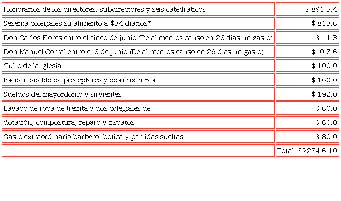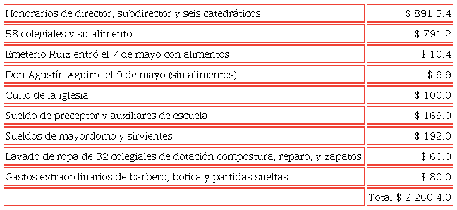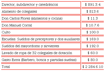 Los datos anteriores fueron anotados por José Zavala y avalados con la rúbrica del director Troncoso. En las fuentes se perciben los gastos que en la vida cotidiana y administración del Establecimiento se llevaron a cabo. Los mayores gastos fueron los dedicados a los sueldos de los profesores y sirvientes, y a la manutención de los jóvenes en el establecimiento. Le seguían los datos sobre las escuelas de primeras letras que continuaron en los espacios corporativos, así como el gasto en los oficios del culto.