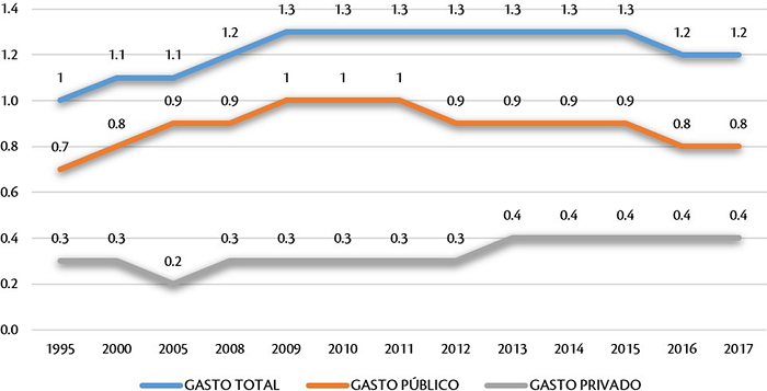 Como muestra la Figura 1, tras una trayectoria de aumento del gasto público en educación terciaria, en 2012 se produce el primer descenso de inversión en 0.1% y un nuevo descenso del mismo valor en 2016, pasando de niveles de inversión pública del 1% del PIB en 2011, a 0.9% en 2012 y 0.8% desde 2016. El aumento del gasto privado se da en 2013, con un incremento de 0.1%, representando un 0.4 % del PIB. Esto ha significado una disminución del total de inversión en educación terciaria como porcentaje del PIB de 1.3% en 2012 a 1.2% en 2017, que especialmente se debe a la baja de inversión pública.