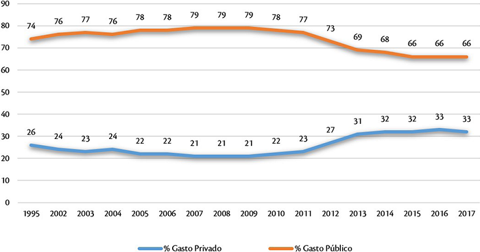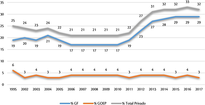 En 1995 el modelo de financiación se dividía en 74% de fuentes públicas y 26% de fuentes privadas, y en 2017 un 66% de públicas y un 32% de privadas, expresado como proporciones de porcentaje del gasto total (Figura 2); es decir, se pasa de un modelo de financiación pública de la educación superior a un modelo mixto, como se analizó con más detalle en otros trabajos (Carrasco-González, 2021).