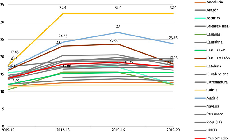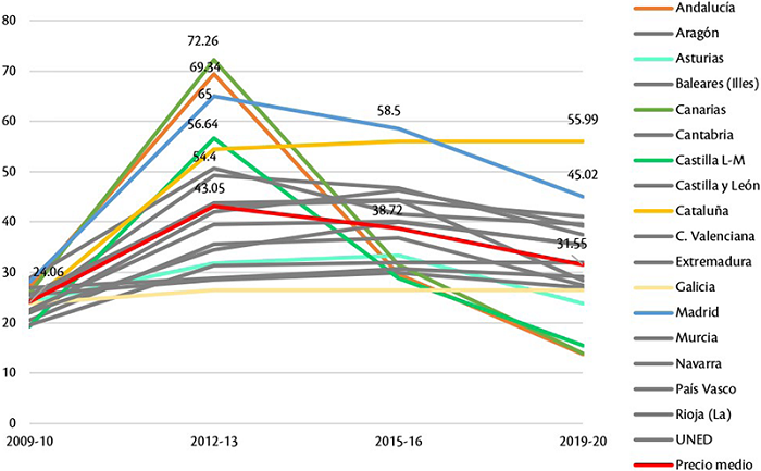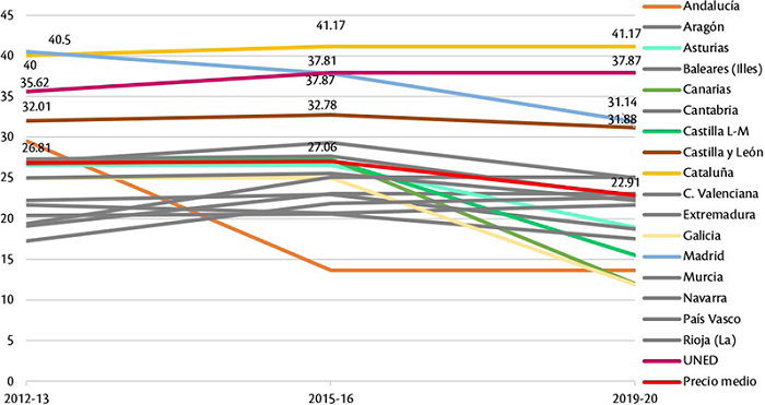 Por otra parte, en los próximos años se espera que la tendencia hacia la disminución del importe continúe tras la derogación del RD 14/2012 por el Gobierno de coalición del 5 de mayo de 2020 y el acuerdo del 27 de mayo de 2020 de la Conferencia General de Política Universitaria (CGPU), en el que se contempló un nuevo método de establecimiento de precios de matrícula fijándose un tope para las CC AA. En el caso de los estudios de grado, se ha fijado un precio máximo de 18.46€ y, por consiguiente, las comunidades que lo sobrepasen se verán obligadas a bajar sus precios. No obstante, según los primeros estudios sobre el balance de precios para el curso 2020-21, todo indica que el acuerdo, en su primer año de vigencia, no ha logrado modificar sustancialmente los precios (Sacristán, 2020).