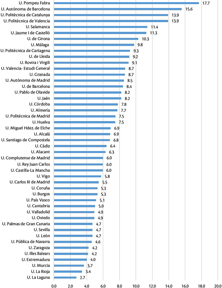 Las universidades que lideran los primeros puestos de porcentaje de estudiantes extranjeros sobre el total de estudiantes, son la Pompeu Fabra (17.7%) y la Universitat Autónoma de Barcelona (15.6%). Le siguen Universitat Politècnica de Catalunya (13.9%) y Universitat Politècnica de València (13.9%) (Figura 8).