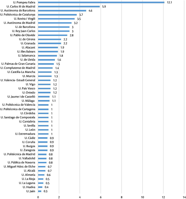 Por otro lado, las universidades que cuentan con mayor porcentaje de profesorado extranjero son la Universitat Pompeu Fabra, que sobresale sobre el total de universidades con 12.1 % de profesores extranjeros, así como cinco universidades más con porcentajes elevados: Universidad Carlos III de Madrid (5.9%); Autónoma de Barcelona (4.6%); Politècnica de Catalunya (3.7%); Rovira y Virgili (3.5%); Autónoma de Madrid (3.2%); de Barcelona (3%); y Universidad Rey Juan Carlos (3%) (Figura 9).