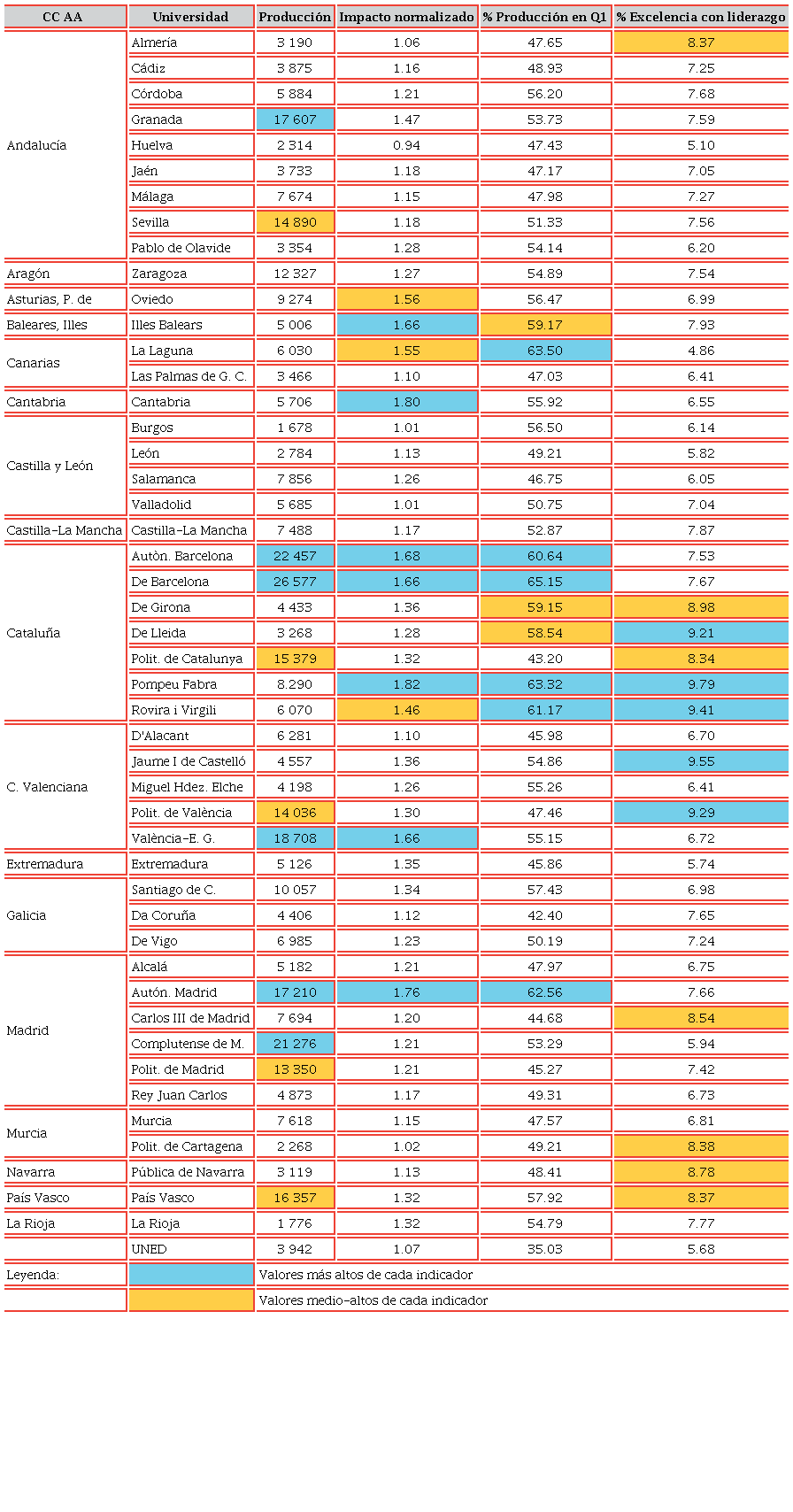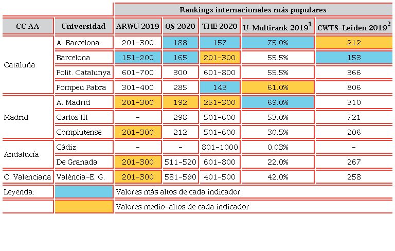Por lo tanto, el conjunto de universidades públicas españolas que más destacan por su producción científica de alto impacto son: Universitat Autònoma de Barcelona, Universitat de Barcelona, Universitat Pompeu Fabra y Universidad Autónoma de Madrid. Tres universidades de la Comunidad de Cataluña y una de Madrid.