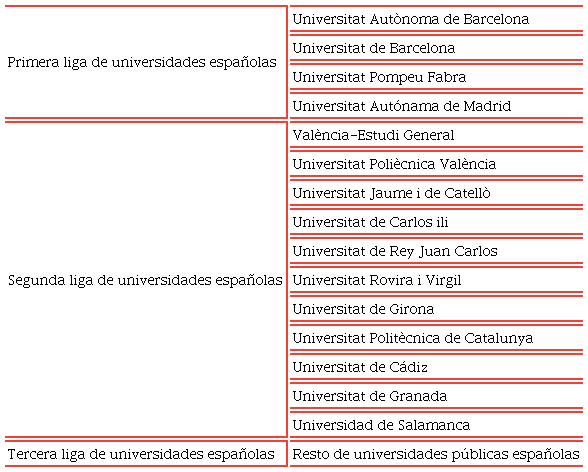Aparte, encontramos otras universidades españolas que se caracterizarían por ocupar puestos más secundarios en los indicadores señalados respecto a las universidades de la primera liga. De esta forma, las universidades españolas públicas de la segunda liga serían aquellas que al menos destacan en uno o dos indicadores del conjunto de los analizados.