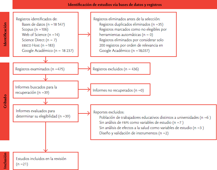 La búsqueda arrojó 18 547 registros, se eliminaron 35 citas duplicadas y 18 037 de la base de datos Google Académico dando un total de 475 registros (véase Figura 1). Aplicados los criterios de inclusión se eliminaron 436 registros y tras la revisión del resumen, se obtuvieron 39 artículos idóneos para la lectura completa. De los 39 estudios, se excluyeron 18, seis debido a que se efectuaron en trabajadores de la educación diferente a la universitaria, siete que no analizaron los FRPS, tres que no identificaron variables de salud y dos más porque se trataban de la construcción y validación de instrumentos de medición; finalmente 21 artículos fueron elegidos para su análisis cualitativo, siete aparecieron en dos de las bases de datos y uno en las cinco bases de datos consultadas.