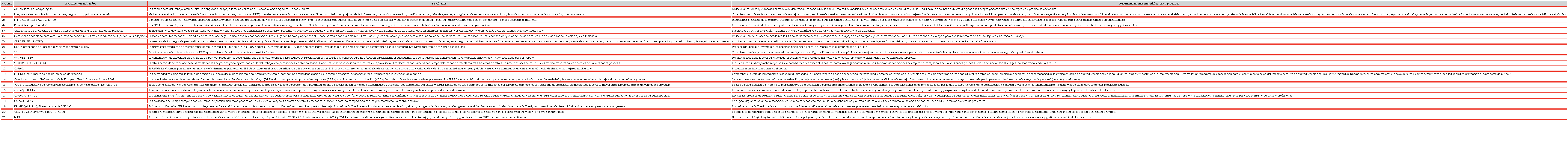 Como se observa en la Tabla 1, cinco estudios incluyeron al personal académico y no académico (artículos 10, 14, 17, 19, 21), tres de ellos (artículos 10, 17, 19) distinguen entre personal docente y no docente. De acuerdo con el tipo de financiamiento, nueve casos (artículos 1, 4, 5, 6, 11, 15, 17, 18, 20) reportan si el estudio fue realizado en instituciones públicas, privadas o ambas, pero sólo en dos se compararon los resultados en función del financiamiento (artículos 11 y 15). Para el caso de la selección de la muestra, el 23.8% (5) utilizó una metodología probabilística (artículos 1, 3, 16, 17, 18), el resto fue por conveniencia. El periodo de recolección de datos se documentó en el 38% (8) de los casos (artículos 1, 10, 11, 17, 18, 19, 20, 21), siendo un periodo amplio entre el 2009 y el 2018; de los artículos analizados bajo los criterios de selección ninguno se realizó durante la pandemia por COVID-19, así mismo se observa que en el 38% (8) los investigadores contextualizaron sus estudios en los cambios en la gestión de la educación superior debido a políticas internacionales y hacia el interior de los países que han impactado negativamente en la salud, sólo el 19% (4) ubicó sus estudios en normativas de SST que impulsan la identificación, prevención y control de los FRPS. Un caso exploró los FRPS y su relación con la salud durante cambios al interior de la organización. En la Tabla 2 se describen los instrumentos para la evaluación de los FRPS, mismos que determinan la orientación teórica de los investigadores, así como los principales resultados y recomendaciones, algunas de origen metodológico, otras son prácticas, y algunos ofrecen sugerencias para avanzar en aspectos teóricos sobre los FRPS.