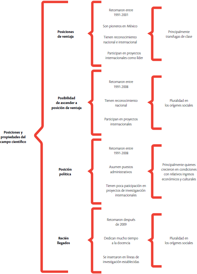 Como se muestra en los ejemplos expuestos, las experiencias de socialización tienen efectos importantes en la población repatriada bajo estudio, y repercute en la posición que cada uno(a) ocupa en el campo científico. A esto nos referimos a continuación.