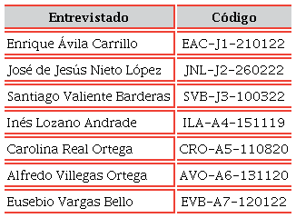 Las entrevistas fueron realizadas durante noviembre de 2019, agosto-noviembre de 2020 y enero-marzo de 2022 mediante sesiones virtuales, debido al periodo de contingencia experimentado, excepto la del 2019, con una duración de dos horas aproximadamente. Se les asignó un código que incluyó: un acrónimo formado por la primera letra de su nombre, apellidos materno y paterno, seguido de su condición laboral, es decir, si son jubilados (J) o están activos (A); el número ordinal del entrevistado (a); el día, mes y año en que se realizó el encuentro. Los docentes entrevistados dieron su autorización para que aparecieran sus nombres en el artículo. En el Apéndice 1 se presenta un cuadro que contiene los docentes-investigadores entrevistados y los códigos de identificación.