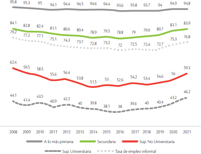Lavado et al. (2014) encuentran que los profesionales que asistieron a universidades de “menor calidad” en Perú tienen una mayor probabilidad de estar subempleados a partir de la desregulación del mercado en los años noventa. En este sentido, si la reforma universitaria mejorase la calidad universitaria, entonces la informalidad laboral o el subempleo se habrían reducido. Sin embargo, la informalidad laboral apenas cayó en un punto porcentual de 2013 a 2019 (prepandemia), mientras que la informalidad de las personas con nivel de educación superior aumentó 0.4 puntos porcentuales (ver Gráfico 10).
