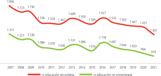 Con respecto a los ingresos laborales, Castro y Yamada (2013) encuentran que la diferencia en las remuneraciones de una persona con educación superior universitaria y una persona con educación secundaria crece, pero a una pendiente mejor desde la desregulación del mercado universitario. En este sentido, la reforma universitaria debería mostrar una mejora en la diferencia de remuneraciones, sin embargo, se observa que la diferencia se reduce sostenidamente (ver Gráfico 11).