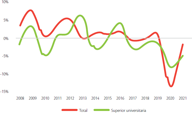 Además, los ingresos laborales de las personas con educación superior universitaria han crecido menos que los ingresos de la población ocupada total en términos reales (a excepción de 2013 y 2016), a pesar de que en este grupo se ha realizado una “reforma” (ver Gráfico 12).