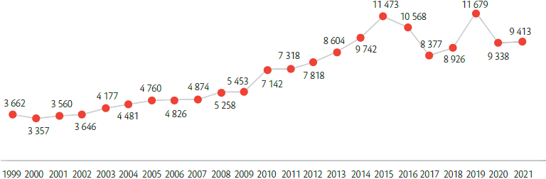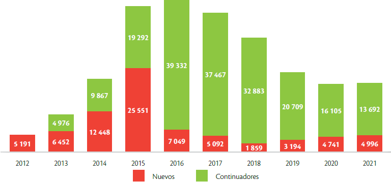 Asimismo, según los datos del Ministerio de Educación, el número de ingresantes a universidades cayó fuertemente desde 2015 y hasta ahora no recupera los niveles alcanzados en dicho año (ver Gráfico 8); lo mismo se observa en el número de matriculados en las universidades (ver Gráfico 9).