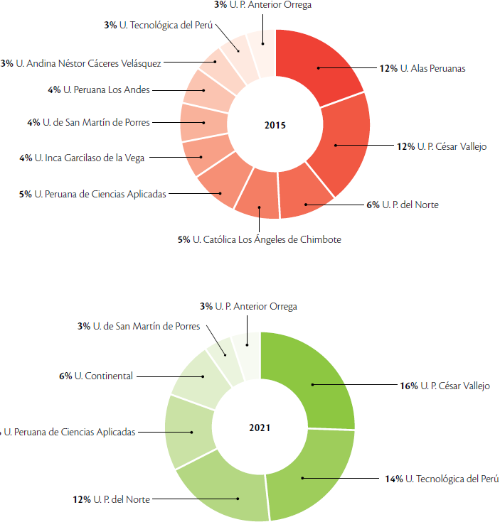 En 2015 (un año antes de la creación de Sunedu), 11 universidades privadas concentraban el 60% del alumnado matriculado en educación superior universitaria; actualmente, en 2021, sólo 7 universidades concentran el 61% del alumnado matriculado (ver Gráfico 5).