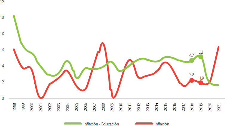 La teoría económica prevé que las barreras reducen la competencia y esto, a su vez, incrementa los precios hacia los consumidores (Shivardi y Viviano, 2011). En este caso, desde que entró en vigor la Ley de Moratoria (2012), la variación de los precios del sector educación (un proxy para medir los precios de la educación superior) supera a la variación total de los precios a los consumidores; y, desde que la Sunedu empezó a cerrar las universidades que no lograban obtener el licenciamiento (2016), la diferencia en el crecimiento de los precios ha aumentado (ver Gráfico 6) hasta 2019, debido a que en 2020 y 2021 fueron afectados por la crisis sanitaria.