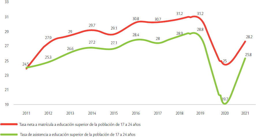 Debido a la reducción de la oferta y al incremento de precios, el acceso a la educación superior y la demanda se han estancado en los últimos años. Según la Encuesta Nacional de Hogares del INEI, la tasa neta de matrícula en educación superior de la población de 17 a 24 años y la asistencia, sólo crecieron en 0.4 puntos porcentuales de 2016 a 2019, en contraste con el incremento de 1.8 puntos porcentuales de 2013 a 2016. (ver Gráfico 7).