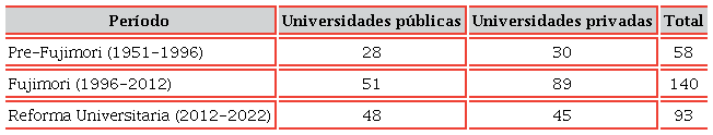 En 1996 existían 28 universidades públicas y 30 privadas. Era necesaria una ley para crear una universidad. Como parte de un paquete para rescatar la economía peruana (“ajustes estructurales”), Alberto Fujimori inició el camino para la desregulación de la educación universitaria en Perú, permitiendo la creación de “universidades empresa” (con fines de lucro). A partir de esta “liberalización”, unida a exoneraciones tributarias, se crearon 61 universidades privadas, llegando a un total de 91 universidades privadas. Por su parte, se crearon 23 universidades públicas adicionales, llegando a un total de 51.