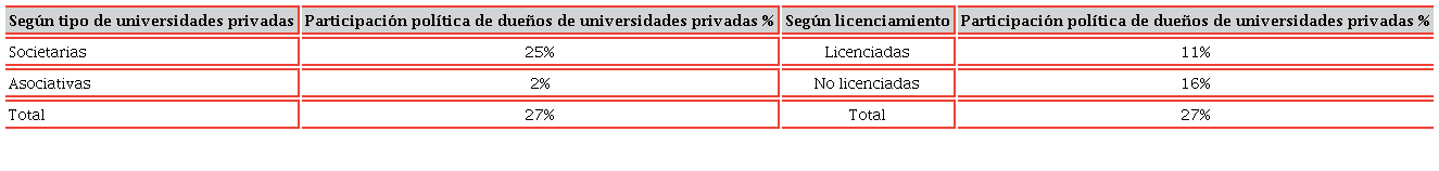 Es compatible con esto el hecho de que dueños de universidades que son percibidas como mediocres o de baja calidad en Perú, pero que tienen espaldas financieras grandes, hayan sido algunos de los principales defensores e impulsores de la reforma y tengan una fuerte presencia en la política peruana (ver Cuadro 4).8 Aunque parezca contradictorio, también es compatible con esto la cantidad de modificaciones y “retrocesos” que ha sufrido y sigue sufriendo la Ley Universitaria. La misma teoría económica predice que ciertos grupos de interés buscarán las restricciones a la competencia, pero simultáneamente tratarán de controlar las restricciones. A inicios de febrero se ha aprobado en primera votación un proyecto de Ley 00943/2021-CR “Que fortalece la institucionalidad de la universidad peruana y recupera su autonomía” que en la práctica le da el control del organismo regulador (Sunedu) a las propias universidades.