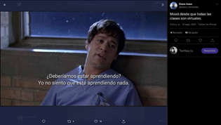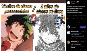 Los Imemes que conforman esta categoría, con humor, expresan las preocupaciones del estudiantado por la falta de aprendizajes en la educación virtual. Además, como se mencionó, emiten una crítica a la ERE debido a que no es un medio propicio para comprender contenidos de carácter teórico-práctico y a otras debilidades, como el exceso de tareas escolares y clases virtuales sin propósitos vinculados al desarrollo de conocimientos.