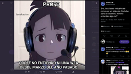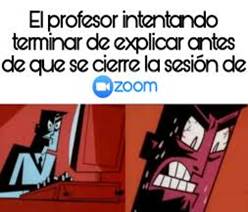 Otro actor central en la educación virtual ha sido el maestro, puesto que en la contingencia sanitaria trasladó de forma inmediata su ejercicio de enseñanza a diferentes plataformas virtuales, en ocasiones con dominio de éstas y en otras con desconocimiento. En el rastreo de los Imemes, se encontraron algunos relacionados con experiencias que tuvieron los profesores en su trabajo de enseñanza en la pandemia. Se debe advertir que esto se realizó desde la mirada de los propios alumnos, quienes son los que generalmente realizaban los Imemes. Si bien no ubicamos Imemes en los que el propio profesor se autonombra en ello (Yo…), es revelador cómo estos contienen algunas de las vivencias que los profesores experimentamos durante la ERE. Esto indica que esos actores también enfrentaron desafíos al asumir la ERE y emplear diferentes recursos tecnológicos para intentar interactuar con sus estudiantes a través de plataformas sincrónicas y asincrónicas.