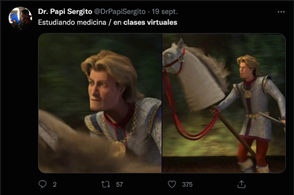 Con el análisis del Imeme 13 se indaga sobre lo que ocasionó la falta de aprendizajes en la educación virtual; en dos viñetas compuestas por imágenes de la película Sherk 2 y su personaje el Príncipe Encantador, donde en la primera parte aparece montado en un caballo, con un acercamiento de cámara y el texto que señala que se está estudiando medicina, lo que establece un paralelismo con cabalgar y aprender la profesión de medicina, la cual comprende diversas actividades entre las que se encuentran conocer la anatomía a través de la vista, el olfato y tacto para identificar las afecciones del paciente. Mientras que en la segunda viñeta se usa una imagen abierta en la que el Príncipe Encantador está montando un caballo de palo, que es una suerte de juguete, lo que puede ilustrar la similitud con cursar medicina en la pandemia a través de las clases virtuales, por ejemplo: tratar de aprender anatomía sin la observación directa del cuerpo humano. En otras palabras, con el Imeme del Príncipe Encantador se emite una crítica a la ERE, ya que poco se aprendió porque para los estudiantes no hubo un vínculo con los conocimientos de orden práctico.
