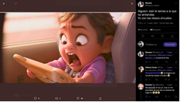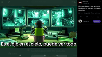 En los Imemes 17 y 18 se hace alusión al uso cotidiano que dieron los maestros a las plataformas sincrónicas para impartir clases. En el Imeme 17 aparece el Profesor Utonio (de la serie animada Las Chicas Superpoderosas) frente a una computadora y en la segunda con un acercamiento éste se encuentra con sudor, apretando los dientes y, al parecer, experimenta estrés. El texto que ancla el significado indica “el profesor intentando terminar de explicar antes de que se cierre la sesión de Zoom”. Se debe señalar, que cuando se emplea esta plataforma sincrónica de forma libre (sin pago) solamente se cuenta con 40 minutos antes de que la sesión se corte de forma automática. Así, el Imeme se refiere a los profesores que no tenían una suscripción personal o institucional a esta plataforma y en esos minutos intentaban impartir los contenidos correspondientes a una clase, lo cual era insuficiente y les provocaba tensión. En el Imeme 18 aparece una imagen de la película animada Toy Story 3 con el personaje del Mono, que se encarga de vigilar de forma extremadamente eficiente las cámaras de vigilancia de la guardería donde se desarrolla la historia, y hay un texto que dice “el ojo en el cielo que lo puede ver todo”. Posteriormente, se encuentra otro texto que dice “el profe viendo a sus alumnos haciendo su examen en clases virtuales”. Así, en este Imeme se compara al maestro con la capacidad de vigilante que tiene el personaje del Mono para asegurarse de que los alumnos no copien en los exámenes. Al mismo tiempo, este Imeme puede ser un indicador de cómo los profesores adaptaron sus prácticas de enseñanza de la educación presencial a la ERE.