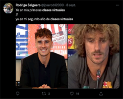 En los Imemes 1 y 2, a través de comparar el antes y el ahora, se expresa, a partir del humor, la fatiga de los estudiantes después de dos años de clases virtuales. En el Imeme 1 aparece Izuko Midoriya, conocido como Duku de la serie de manga My hero academy, quien está alegre, con el texto “12 años de clases presenciales” y de lado izquierdo, el mismo personaje, pero en blanco y negro, con los ojos entrecerrados, con agotamiento y con la leyenda “dos años de clases virtuales”. El Imeme 2 utiliza la imagen de Antoine Griezmann, futbolista francés campeón del mundo; en la primera viñeta, de lado izquierdo éste se encuentra sonriente, con el pelo corto y dice “yo en mis primeras clases virtuales”, como si ocupara el lugar de un alumno. En la segunda viñeta aparece Griezmann pero con el pelo largo, despeinado, y tal parece que experimenta desaliento, con el texto “yo en mi segundo año de clases virtuales”. En estos dos Imemes se transmite la información de que la educación virtual provocó cansancio y desgaste en los alumnos. La sobrecarga de actividades escolares en la educación virtual fue un signo de ésta que ha sido reportado en diferentes trabajos (ANUIES, 2022; López-Ramírez y Andrés-Rodríguez, 2019; Iño, 2021).