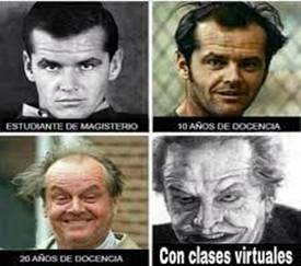 En el Imeme 21 se presenta con cuatro fotografías del actor Jack Nicholson y aborda los efectos de la educación virtual en los maestros. Éste fue el único Imeme del corpus donde el maestro se representa a sí mismo. En la primera foto se encuentra el actor muy joven (casi adolescente) y se indica estudiando para maestro; en la segunda el actor, en una etapa madura, está un poco despeinado y con barba, se apunta con diez años en la docencia; la tercera foto está con edad más avanzada, calvo, despeinado y sonriente, para señalar que son 20 en la enseñanza; para finalizar, en la cuarta foto el actor en el personaje de Guasón de la película de Batman, quien es un criminal y psicópata, se enuncia que es el maestro en clases virtuales. En este Imeme Jack Nicholson representa al maestro y sus diferentes fotos se relacionan a la antigüedad en esta profesión, que, según las imágenes, es dura y cansada, pero que las clases virtuales han agotado a los maestros en un grado importante. Como se observa en los Imemes que conforman esta categoría, los maestros en la educación virtual necesitaron dominio de las tecnologías digitales, pericia para tratar los contenidos escolares en poco tiempo, actitudes como la observación de sus estudiantes en la pantalla, lo que pudo representar un desafío.