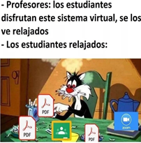 En el Imeme 3 aparece el gato Silvestre, personaje de Loony Tunes de Warner Brothers, fumando cinco cigarros a la vez, con los ojos rojos, actitud ansiosa y sobre puestos los íconos de las plataformas Zoom y Classroom, así como de PDF3 y del lado derecho se ubica una jarra que parece de café. El texto del Imeme hace referencia a que los estudiantes estaban abrumados por la cantidad de tareas y actividades que debían realizar en la educación en línea mientras que los maestros consideraron que los alumnos disfrutaban esta modalidad educativa. En este Imeme se expresan las fuertes cargas de trabajo académico que tuvieron los estudiantes y la tensión que les provocó su realización. Lo cual coincide con algunos estudios que indicaron que en el nivel superior la educación virtual se distinguió porque el profesorado dictaba clases en plataformas sincrónicas por períodos de tiempo considerables, asignaba lecturas y una gran cantidad de trabajos escolares, pero sin una estrategia de aprendizaje definida, es decir con un propósito claro vinculado a la formación profesional de los estudiantes (Díaz-Barriga, 2021; Iño, 2019).