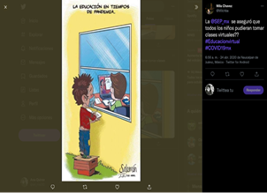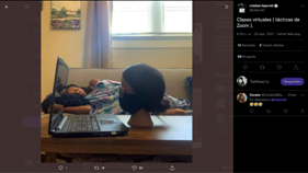 La experiencia comprende una dimensión reflexiva que implica la enunciación de críticas sobre la situación en donde se encuentra el actor (Dubet y Martucelli, 1998). En esta tesitura, en el análisis se encontraron Imemes que hacían referencia a las dificultades que implicaba la educación virtual para estudiantes de determinados grupos sociales. En el Imeme 5 a través de un dibujo animado aparece un estudiante en su casa siguiendo sus clases en línea, mientras que fuera se encuentra otro alumno con ropa desgastada y sobre unas cajas que le permiten mirar a través de la ventana para tomar la clase. Con este Imeme se expresa una crítica a la desigualdad económica y brecha digital de los estudiantes, lo que provocó condiciones poco favorables para la formación profesional. Si bien éste fue un problema que desde el inicio de la pandemia advirtieron los expertos, lo singular es que se convirtió en un aspecto que conformó parte de la experiencia de los estudiantes en la educación virtual que se expresó a través de los Imemes.