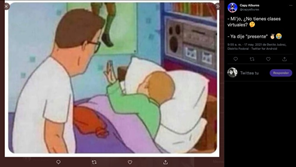 En el Imeme 6 aparece al fondo una mujer dormida y en primer plano una laptop que tiene frente a la cámara un maniquí como si estuviera tomando clase, y se indica que es una de las tácticas que los estudiantes seguían en la educación virtual. Mientras que en el Imeme 7 se muestra, a través de un dibujo animado, a un padre sentado sobre la cama de su hijo mientras éste tiene pijama y duerme, el padre lo cuestiona sobre si tiene clases, a lo que responde que ya dijo presente. Es decir, el maestro pasó lista y el estudiante respondió para posteriormente regresar a su cama a dormir. Así, se hace alusión a que en los cursos sincrónicos los alumnos aparecían los primeros minutos de clase para que el profesorado notara su presencia y posteriormente, dejaban la cámara apagada para continuar durmiendo. Al mismo tiempo los anteriores Imemes ofrecen indicios de que en la ERE el profesorado, al no ser experto en entornos virtuales de aprendizaje, se concentró en verificar que los alumnos ingresaran a las plataformas como Zoom y Meet a través del pase de lista y posteriormente dictaban su clase, con poca interacción entre el grupo.