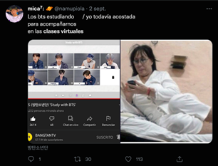 El Imeme 8 se presenta con dos viñetas, en la primera de lado izquierdo aparecen los integrantes del grupo de K-pop BTS con ropa de día, peinados, tomando clases en una plataforma sincrónica con la cámara encendida. En la segunda viñeta de lado derecho se encuentra una mujer con pijama, recostada en una suerte de camastro, quizá recién despierta, con su teléfono celular en la mano. La frase del Imeme apunta que los integrantes de BTS los acompañan en clases virtuales y la mujer está todavía acostada, pero tiene la posibilidad de tomar clases. Se observa que en la educación virtual los estudiantes, en su cama, con pijama y a través de celular o computadora podían seguir sus cursos. Así, la cama se convirtió en el objeto y el dormitorio en el espacio donde tuvo lugar la ERE. En este sentido Dussel y Paez (2022: 279) afirman que la educación virtual provocó “la domesticación del espacio escolar que, en línea con la cama multifunción, provoca una indiferenciación de tiempos y espacios, intensifica el trabajo y dificulta organizar un encuadre específico”. Lo que se observa en los Imemes es que la cama es uno de los objetos que integran la representación social de la educación virtual, como si ésta sustituyera al salón de clases y las bancas.