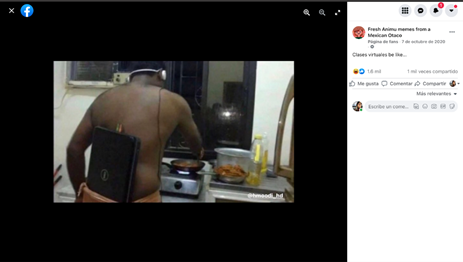 La experiencia escolar en los estudiantes se articula por el seguimiento del plan y los programas de estudios a través de los diferentes cursos que imparte el profesorado, en la presencialidad tiene lugar en el salón de clase, en el intercambio de ideas con los maestros y compañeros se da la convivencia con compañeros y amigos en diferentes espacios como jardines y pasillos que son un punto neurálgico (Dubet y Martucelli, 1998). Mientras que en la ERE las salas virtuales, las plataformas como Classroom y Moodle, así como los chats, fueron espacios en los que tuvo lugar la formación de los estudiantes. Esto llevó al alumnado a seguir sus actividades escolares desde sus casas. La cocina, la sala o la cama se convirtieron en aulas provisionales para seguir clases que, como se observó en la anterior categoría, provocaban agotamiento y estrés. Los cuatro Imemes que conforman esta categoría tienen como telón de fondo la irrupción de la institución escolar en los hogares de los estudiantes, es decir, en sus espacios privados que no estaban acondicionados para ser entornos adecuados de aprendizaje y al mismo tiempo, a través de la sátira, caricaturizan o parodian las tácticas que desplegaron los estudiantes para hacer parecer a sus profesores que se encontraban tomando clases en plataformas como Zoom o Meet.