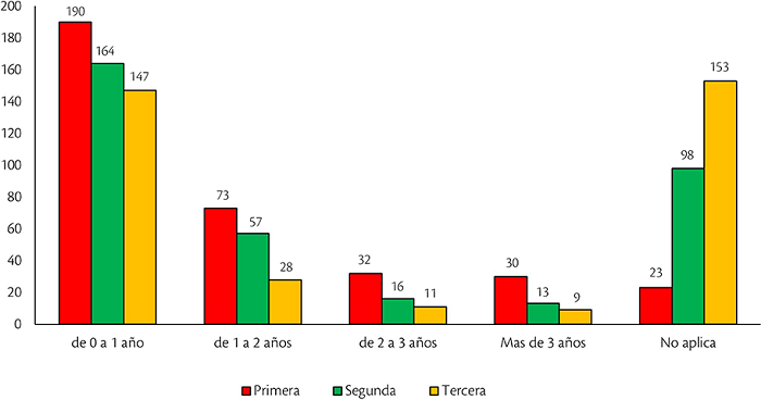 La permanencia de los egresados en sus primeros espacios de asignación docente varían de acuerdo con la temporalidad y se encuentran influenciados por decisiones sindicales y oficiales que impiden que el proceso de inserción en la comunidad sea positivo. La Figura 2, demuestra que el 54.5% de los encuestados permaneció en su lugar de primera adscripción menos de un año, en su segunda asignación el 47.1% y en la tercera adscripción 42.2%; lo que implica que las relaciones con la comunidad y el sentido de permanencia no se desarrollen totalmente.