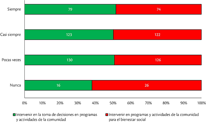Sobre la intervención en la toma de decisiones en programas y actividades de la comunidad e intervención en programas y actividades de la comunidad para el bienestar social, los resultados arrojan porcentajes del 37.3% y 36.2% en pocas veces en ambos casos, y 35% en casi siempre respectivamente para los dos cuestionamientos.
