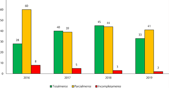 Caso contrario con las generaciones 2017 y 2018 (84 y 92 encuestados respectivamente) en donde la valoración fue levemente positiva a totalmente, en 47.6% y 49%. Mientras que en la de 2019 (76 encuestados), 54% mencionó que parcialmente; lo anterior puede derivarse de su poca experiencia en el ejercicio profesional (Figura 4).