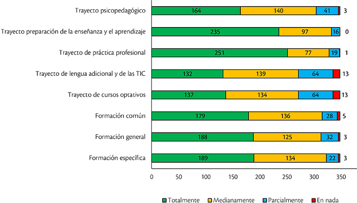 En similitud a la formación en otras áreas del conocimiento, los planes y programas de estudio de educación inicial en las EN, se encuentran desagregados en campos o trayectos formativos específicos a cada una de las licenciaturas; en este sentido, se les cuestionó a los egresados si los contenidos curriculares de los cursos de cada uno de estos son pertinentes para enfrentarse al campo laboral. Los trayectos que más sobresalen son el de Práctica profesional con una respuesta de totalmente de 72.1% y en donde se agrupan todos los cursos o experiencias educativas de la práctica en condiciones reales de trabajo de primero a sexto semestres y, práctica intensiva y aprendizaje en el servicio durante el séptimo y octavo semestres. Son cursos con énfasis en el acercamiento paulatino a la actividad profesional en contextos específicos y en su análisis (DOF, 2012: s/p).
