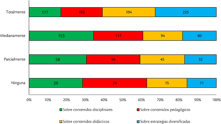 Ante la inminente reforma curricular de los planes y programas de estudio de educación normal proyectada para el año 2022, en retrospectiva, cuestionamos a los egresados acerca de la reorganización de las mallas o mapas curriculares de cada una de las licenciaturas; en especifico, la inclinación más positiva se encuentra en cuanto a estrategias diversificadas y contenidos didácticos y pedagógicos (Figura 6).