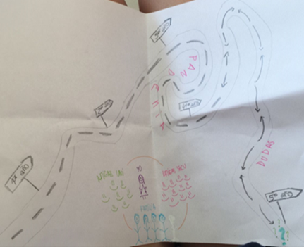 El compartir experiencias académicas y emociones parece sostener trayectorias en la universidad. Tal como se observó en otros estudios, la dimensión vincular parece tener un papel destacado en las trayectorias (Ziegler y Nobile, 2012) y en los procesos de permanencia (Macchiarola et al., 2021; Paoloni; 2015; Stábile et al., 2020). En el presente estudio, la dimensión vincular refiere especialmente a relaciones con grupos de estudio y amigos en la universidad, aunque también algunas participantes destacan la importancia del apoyo de la familia, la pareja y los docentes. En algunos casos, la relevancia de los vínculos, tanto su apoyo como su contención, se evidencia en producciones gráficas, como la Figura 1. En esta producción se observan personas que rodean a la participante, estas personas están identificadas como familia, amigas de la uni (universidad) y amigas del secu (secundario). En el dibujo se observa un camino con curvas y carteles que indican 1° año, 2° año, 3° año, 4° año y 5° año. En tercer y cuarto año aparecen más curvas y se incluye la palabra PANDEMIA en mayúsculas. Llegando a quinto año, se observa, también en mayúsculas, la palabra DUDAS. En suma, la trayectoria representada se caracteriza por la no linealidad, la importancia de los vínculos, la complejidad de la pandemia (representada por mayor cantidad de curvas) y las dudas que aparecen al final del camino.