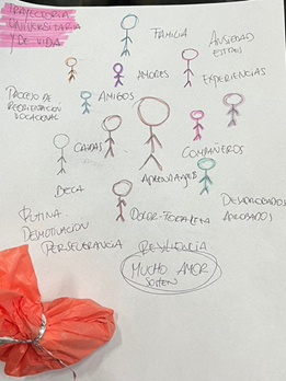 En la presente categoría destacamos el valor de los vínculos y los afectos en las trayectorias, en las expresiones y producciones de las participantes se visualiza que las relaciones con otras personas son fundamentales para transitar la universidad. Los vínculos con otros permiten desarrollar procesos de aprendizajes de contenidos específicos pero, especialmente, posibilitan vivenciar experiencias y emociones emergentes en diferentes momentos del recorrido. En las voces de las participantes, las emociones y los aprendizajes vinculados a la gestión de las mismas parecen ser condicionantes importante en las trayectorias. Todas se refieren al grupo de pares como espacio de sostén y acompañamiento ante la angustia, la ansiedad, la incertidumbre y el miedo en diferentes momentos de las trayectorias. La importancia de los procesos emocionales también se observa cuando preguntamos respecto de los aprendizajes construidos en la universidad, temática que abordamos en la próxima categoría.