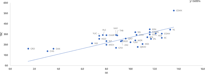 Por otra parte, al observar la dispersión gráfica de las parejas ordenadas del IM y la TBC se identifica que los valores de las entidades federativas se compactan a lo largo de la recta de regresión, lo cual es congruente con el alto valor del coeficiente de determinación obtenido. Es decir, la variabilidad entre los valores observados y estimados es mínima.