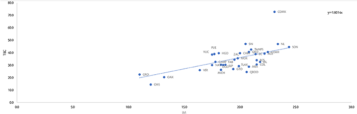 Al observar el comportamiento de los datos en los dos momentos en el tiempo se obtienen reflexiones que son relevantes en la explicación de la TBC. Por una parte, como se puede observar en el diagrama de dispersión correspondiente al año 2010 (Gráfica 1), las entidades federativas se posicionan en tres grupos. El primero muestra aquellos estados que poseen una TBC baja y una alta marginación; es el caso de Chiapas, Guerrero y Oaxaca. El segundo grupo concentra 28 entidades federativas, en el cual se identifica que existen estados en los que la TBC es similar a los del primer grupo, pero con una marginación menor (Guanajuato y Quintana Roo); entidades federativas en las que la TBC se ubica en un valor medio con un IM medio (Chihuahua, Puebla y Nayarit); y aquellas cuya TBC es menor, con un nivel de marginación también menor (Estado de México, Tlaxcala, Morelos). En el tercer bloque se encuentra la Ciudad de México. Es un caso atípico en la medida en que la TBC es la más alta del país, mientras que la marginación es la más baja.