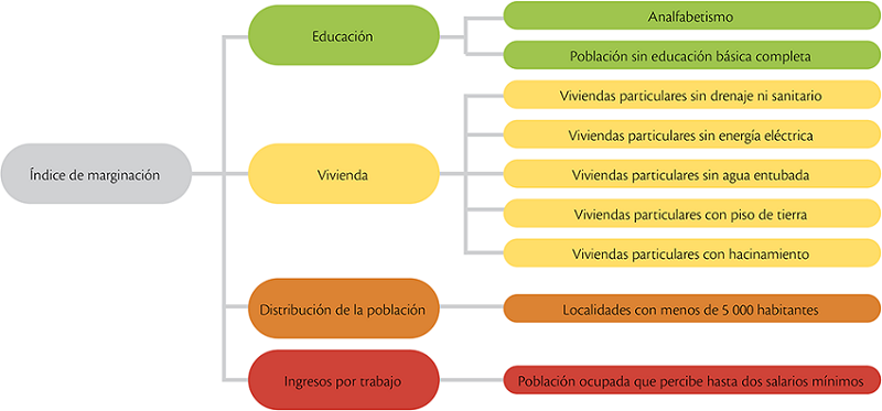 El índice de marginación (IM) es un indicador que mide y caracteriza el grado de marginación de una determinada población. La marginación es un concepto que refleja la relación entre desarrollo socioeconómico y territorio. Indirectamente permite construir una idea de los elementos que definen las condiciones de vida de la población que los habita (Cortés y Vargas, 2011). Las dificultades de acceso a los recursos y servicios necesarios para el desarrollo de las capacidades limitan la calidad de vida de las personas y se constituyen en un lastre para el progreso de la sociedad (Peláez, 2017). Tal como el fenómeno mismo de la marginación, el IM es multidimensional, es decir, incorpora un conjunto de indicadores sociales y económicos relacionados con el desarrollo social y económico de la población dentro de un área geográfica determinada.
